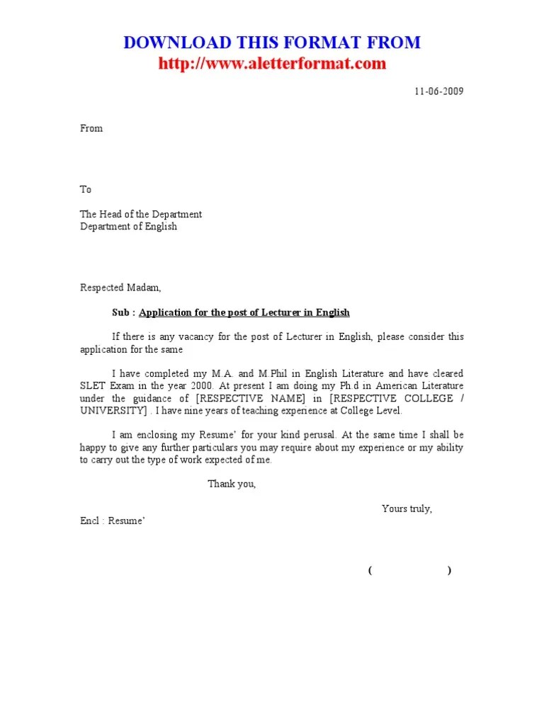 Format Of Application Letter For Lecturing Job